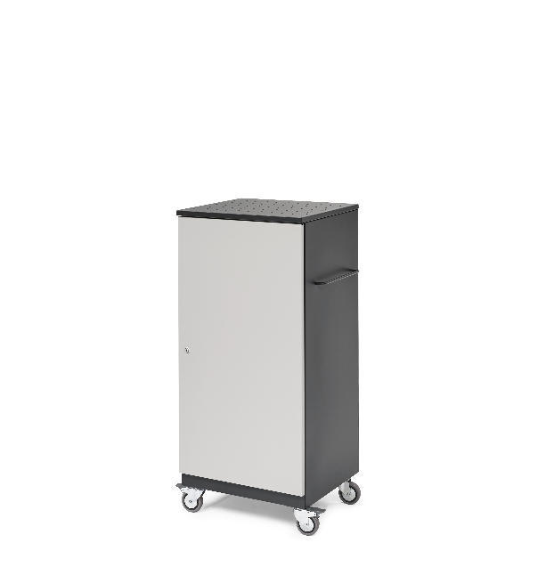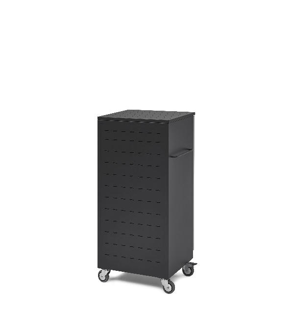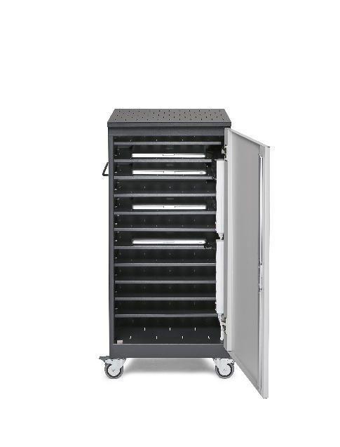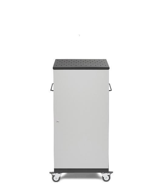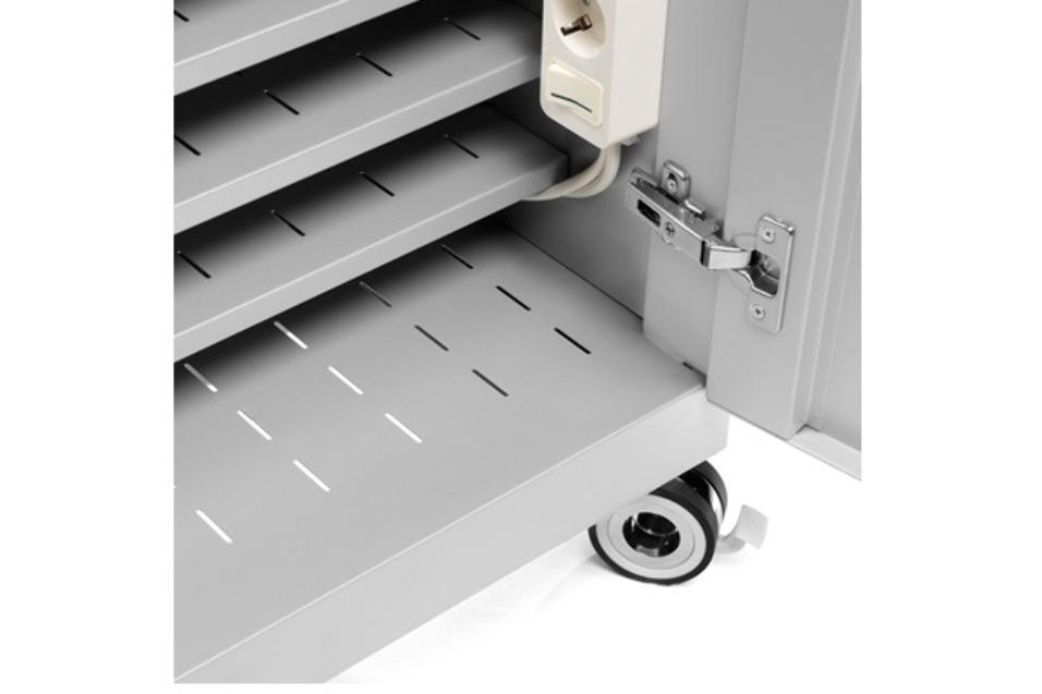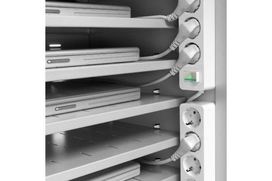 Armario cargador fabricado en chapa de acero reciclado y acabados en pintura epoxi, ideal para espacios pequeños. Carga secuencial de los equipos (se pueden cargar 12 equipos simultáneamente). Puerta con cerradura de seguridad. Ranuras de ventilación en la parte posterior, inferior y superior. Instalación eléctrica con interruptor automático magnetotérmico. Disposición de regletas en los laterales con botón on/off