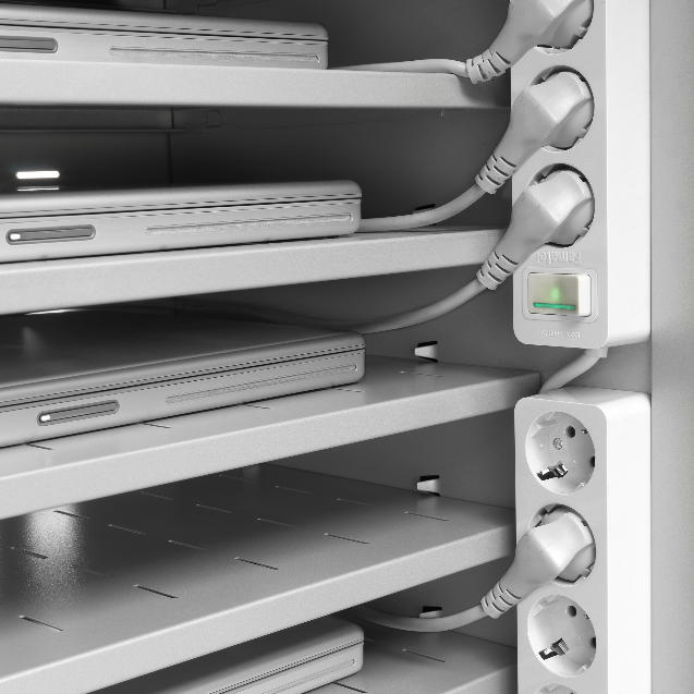 Capacidad de carga para 12, 24 y 30 portátiles o dispositivos compatibles. Distribución horizontal para evitar sobrecalentamiento, doble puerta con cerradura de seguridad, regletas (shucko) en los laterales con botón con on/off, Ranuras de ventilación en la parte posterior, inferior y superior, Incluye magneto térmico.