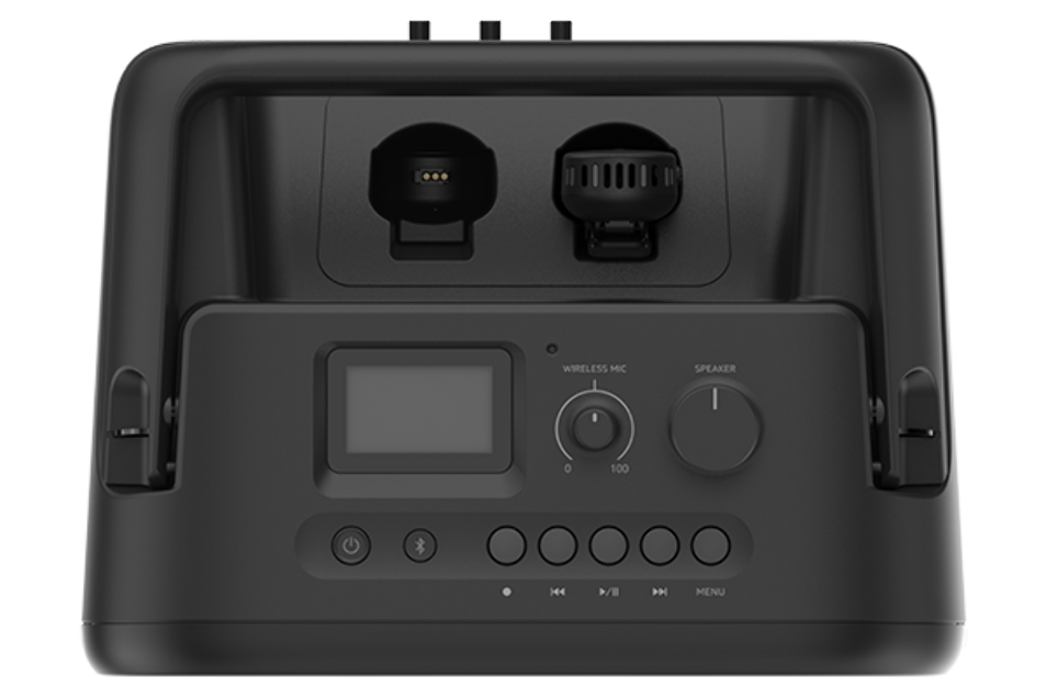 Micrófono inalámbrico con hasta 8–10 h de autonomía, alcance ~20 m (65 ft), se recarga en el propio sistema