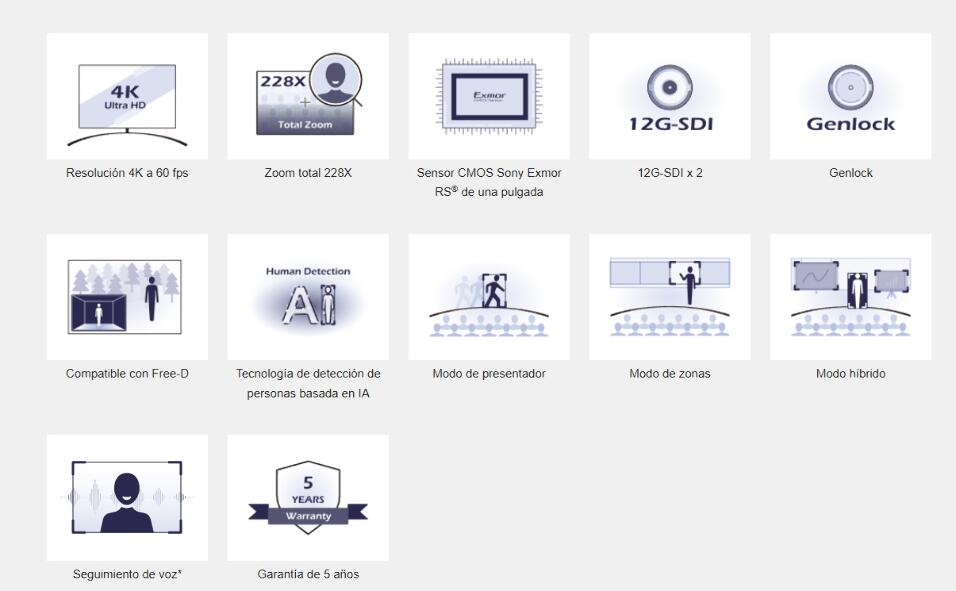 • Modos de seguimiento: presentador, zonas, híbrido y seguimiento de voz*.