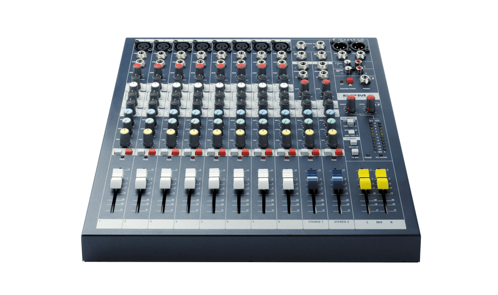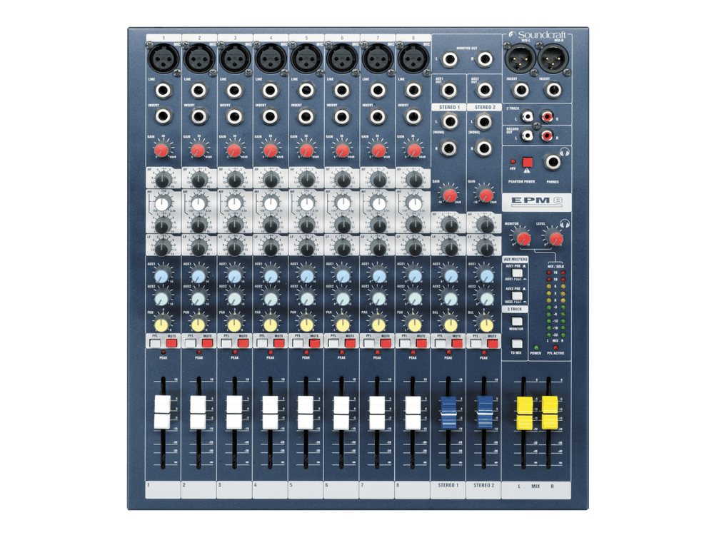 El énfasis con la Soundcraft EPM está muy firmemente en la calidad de construcción y el rendimiento de audio, con una superficie de control fácil de entender y despejada de funcionalidades innecesarias, y Soundcraft ha incorporado nuevas tecnologías e ideas a esta gama muy rentable. Se utiliza tecnología de montaje en superficie en todo el equipo, con componentes de alta precisión para ajustes exactos y repetibles en los controles de EQ y ganancia. El altamente transparente amplificador GB30 para micrófono (diseñado por Graham Blyth para el 30º aniversario de la compañía, y también utilizado en las consolas más grandes de las series LX7ii y GB) presenta un ajuste de alta resolución en un amplio rango de ganancia de 55dB, y proporciona un impresionante margen de +22dB a través de la consola. La alimentación Phantom profesional de 48 voltios atiende a micrófonos de condensador de todo tipo.Una característica única del monitoreo de señal es el led PEAK. Este utiliza puntos de toma de señal en múltiples lugares para monitorear la sobrecarga en varias partes de la tira de canal, y el led se ilumina más intensamente a medida que la señal se acerca al punto máximo. Para un control de canal suave y preciso, la EPM cuenta con faders de alta calidad de 60 mm como los utilizados en otras mesas de Soundcraft. La salida de monitoreo y la salida de auriculares funcionan en paralelo para que los intérpretes puedan seguir escuchando con auriculares mientras un ingeniero está escuchando en monitores de estudio.Características