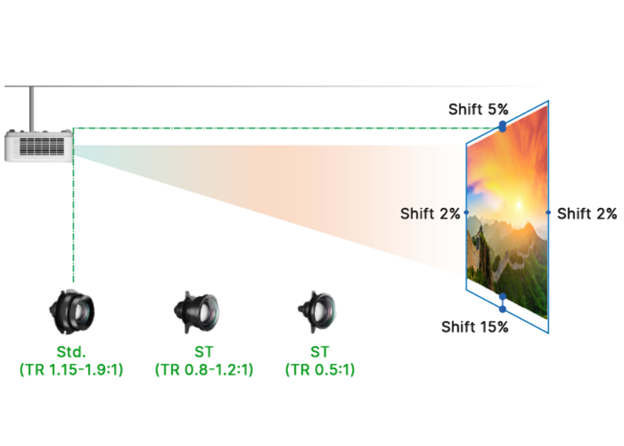 Las lentes de corta distancia disponibles para la serie D5000Z nos permitirán adaptar el equipo a proyecciónes más cercanas sin sacrificar tamaño de imagen.