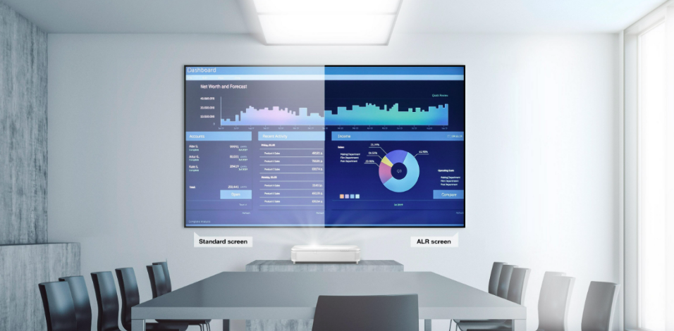 Las pantallas ALR ( Rechazo de Luz Ambiental ) mejoran la calidad de la imagen en espacios iluminados, mejorando el contraste, ya que disponen de una tecnología capaz de reflejar la luz del proyector y rechazar la ambiental. Sácale el máximo partido a tu proyector de Ultra Corta Distancia ( siempre ubicado, en posición sobremesa ) con ésta pantalla.