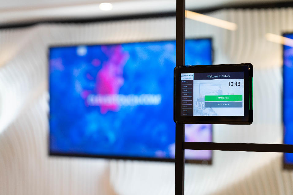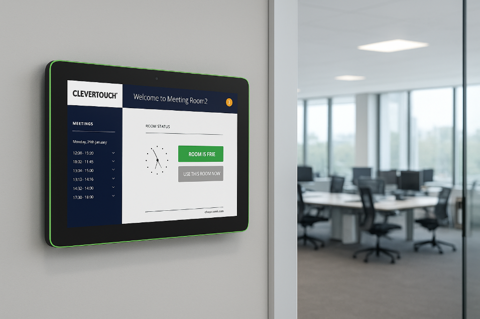 El sistema de reservas de salas CleverLive Rooms 2 permite ver al instante qué salas están libres o ocupadas, gracias a su pantalla táctil y luces LED verdes/rojas que indican el estado.