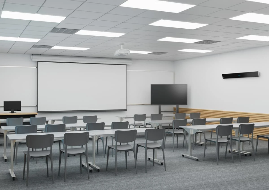 - Educativo: Para aulas híbridas o salas de formación en universidades, donde los participantes pueden moverse por el espacio y se necesita captura de voz en toda el aula.